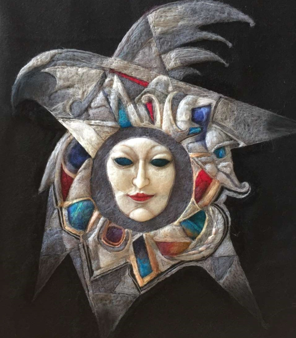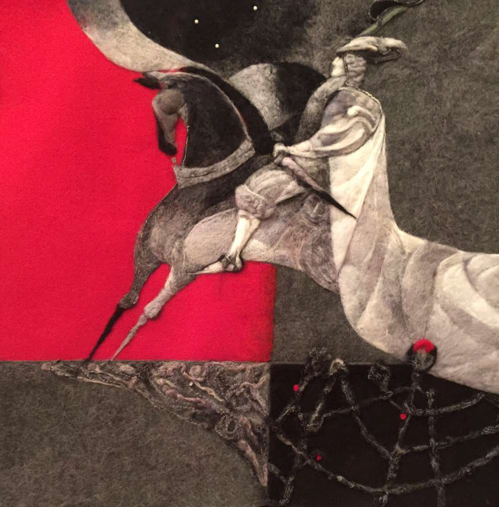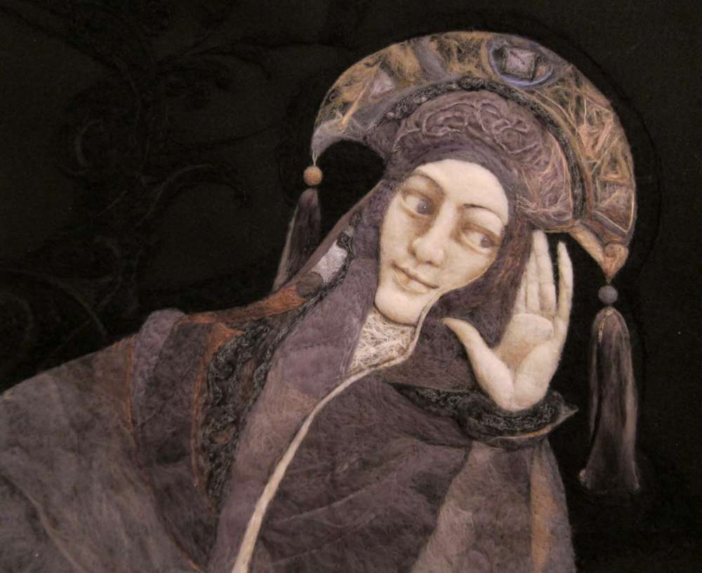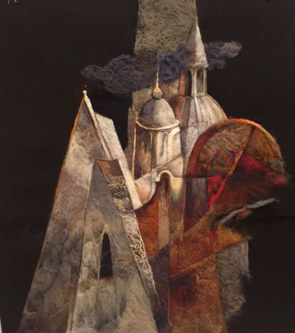 Fiber paintings created with wool roving, silk fibers, yarn and felt.